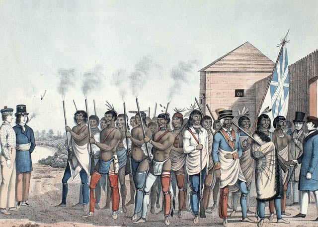 The Red Lake Chief with some of his followers arriving at the Red River, Peter Rindisbacher, 1825. Source: Library and Archives Canada.