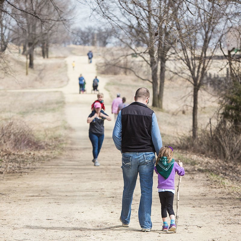 The Kelley Farm nature trails wind along the Mississippi River and through woodlands and restored prairie.