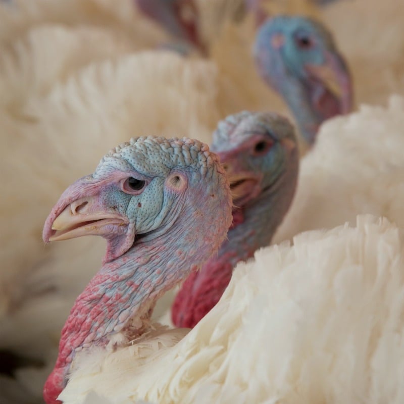 Many farmers that raise turkeys or chickens for meat (called broilers) start off with poults or chicks that are within 12 hours of hatching. They then raise these poults or chicks inside climate-controlled barns with food rationed specifically to best supply the birds as they age and grow. Thanks to years of selective breeding and to careful management, farmers are able to raise poultry to a slaughter size quickly and efficiently. Turkeys can reach reach 35-42 pounds in 16-19 weeks, and broiler chickens can reach 5 pounds in 5 weeks.