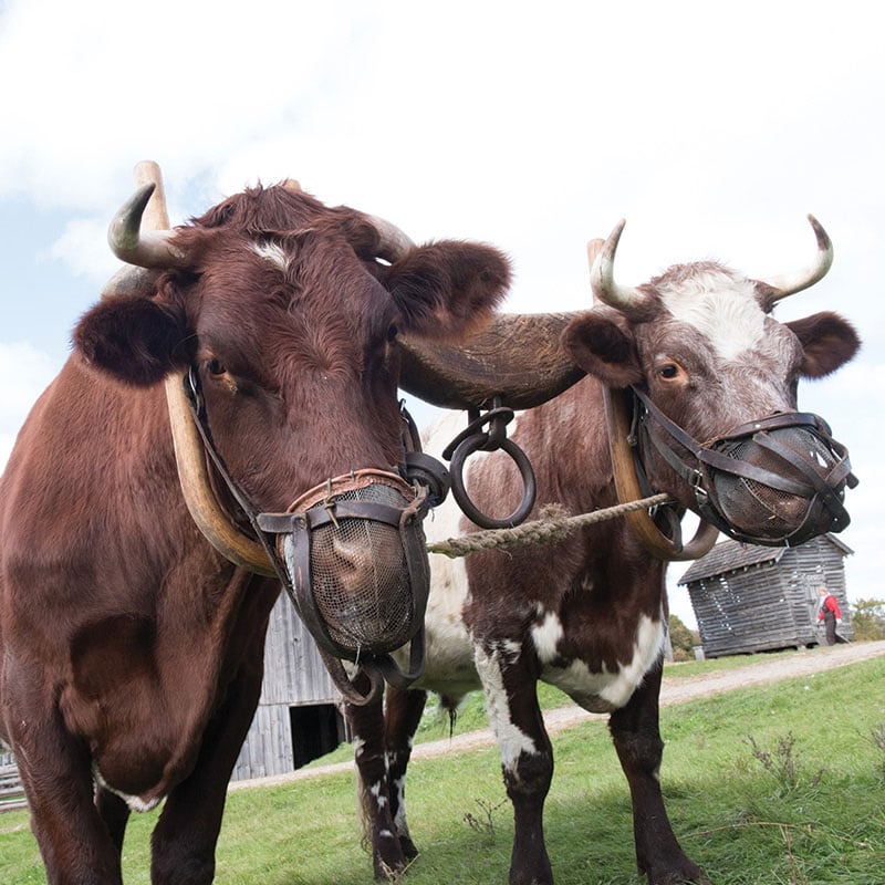 Shorthorn Cattle were a common 19th-century breed. Bulls that have been neutered (steers) and trained to do farmwork are called oxen. Young farmers would often train steer calves to work in the fields for four years until they were fully grown. Oxen are very strong and easy to take care of, but they are very slow workers. Kelley eventually invested in horses instead because they could get more work done, even though they were harder to care for.
