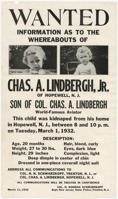 On Mar 1, 1932, Charles Lindbergh, Jr., the first child of Charles and Anne Lindbergh, was kidnapped from his home. Two years later an arrest was made.