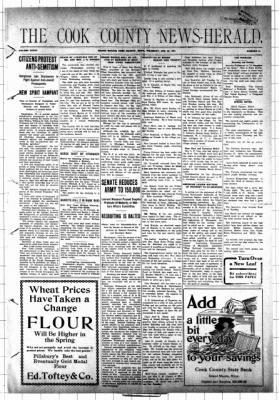 The Cook County Herald was sold to John A. Blackwell, editor of Grand Marais’ Republican newspaper the Grand Marais News, in December 1907. He combined the two titles and began publishing the Grand Marais Cook County News-Herald on December 19, 1907. The new title continued to be published weekly and focused on local news items. It also featured Timber and Stone Act notices, agricultural columns, current affairs, state and national news, literature serials, and columns for women and young readers. Blackwell sold the Cook County News-Herald in 1912 and moved to Florida, but reacquired it in 1920 when he returned to Grand Marais. He published the paper until 1928, when he sold it to Benjamin H. Scott and Adolph A. Toftey. The Cook County News-Herald has changed hands many times since then; however, it continues to be the major publication of the community up to the present day.
